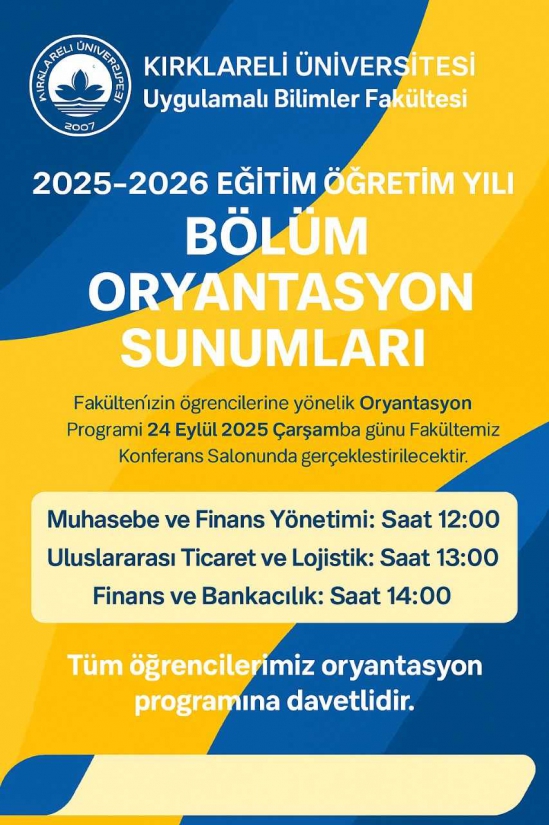 2025-2026 Eğitim-Öğretim Yılı’na başlarken, sizleri fakültemizin akademik yapısı, bölümlerimizin işleyişi ve sizlere sunulan imkânlar hakkında bilgilendirmek amacıyla düzenlenen Bölüm Oryantasyon Programına davet ediyoruz.