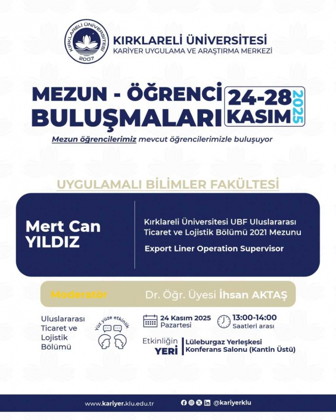 Moderatörlüğünü Dr.Öğr.Üyesi İhsan AKTAŞ' ın yapacağı Mezun-Öğrenci Buluşmaları etkinlikleri kapsamında 24 Kasım 2025 tarihi saat: 13.00' da Lüleburgaz Yerleşkesi Konferans Salonunda (Kantin Üstü) 2021 yılı mezun öğrencilerimizden Mert Can YILDIZ misafirimiz olacak ve bu kapsamda mevcut öğrencilerimizle mezun olduktan sonraki tecrübelerini paylaşacaktır.