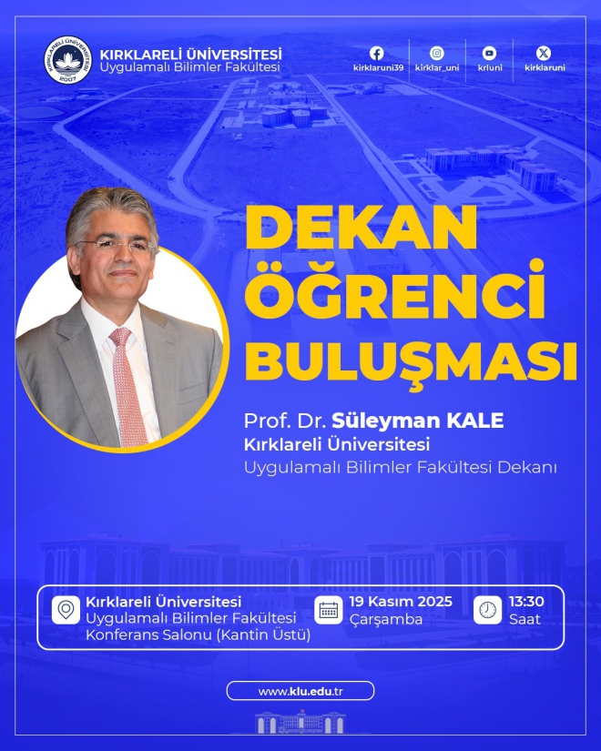 Etkinlik kapsamında, Fakültemiz Dekanı Prof. Dr. Süleyman KALE, öğrencilerimizle bir araya gelerek eğitim-öğretim süreçlerini, akademik çalışmaları ve öğrenci memnuniyetine ilişkin konuları değerlendirecektir.