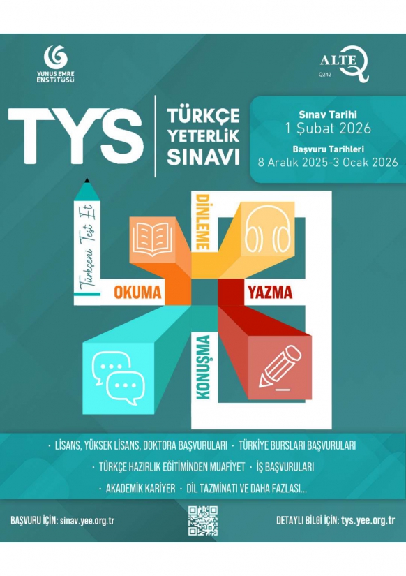 Yunus Emre Enstitüsü tarafından 1 Şubat 2026 tarihinde yapılacak olan Türkçe Yeterlik Sınavına (TYS) ilişkin ayrıntılı bilgiye adresinden ulaşılabilir.