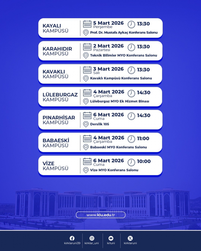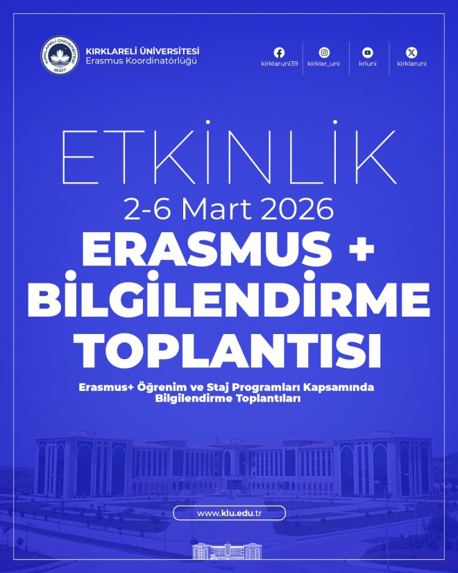 Üniversitemiz öğrenci ve personeline (akademik ve idari) yönelik olarak Erasmus+ Programı Bilgilendirme Toplantıları düzenlenecektir. Gün ve saatleri tabloda belirtilen toplantılara, başta Erasmus koordinatörleri olmak üzere tüm öğrencilerimizin ve personelimiz davetlidir.