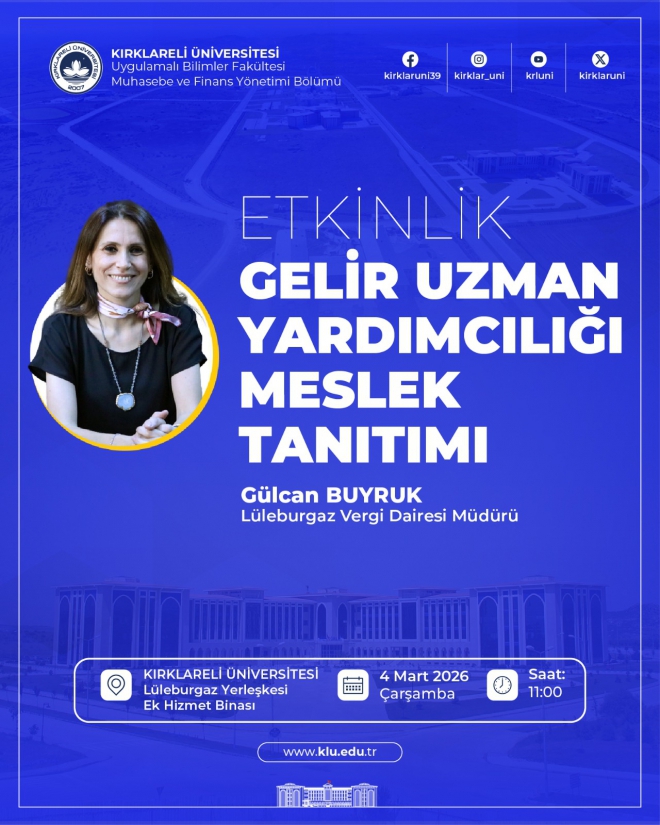 Fakültemiz Muhasebe ve Finans Yönetimi Bölümü tarafından, “Gelir Uzman Yardımcılığı Meslek Tanıtımı” konu başlıklı etkinlik düzenlenecektir.